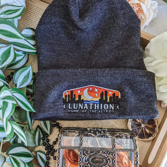 The clerk at the Lunathion Tourism Center would like you to know that this beanie is great for outdoors, sports, and everyday. Made in a unisex cuffed style, it is snug and form-fitting. All beanies are cuffed and you have the option of with or without a pom pom.