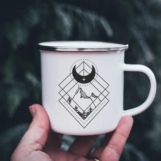 The 11oz and 15oz mugs are durable, microwave and dishwasher safe (top rack). They come in white, black, or both! The enamel mug is rugged stainless steel with an enamel coating. Great for camping, but not microwave or dishwasher friendly.