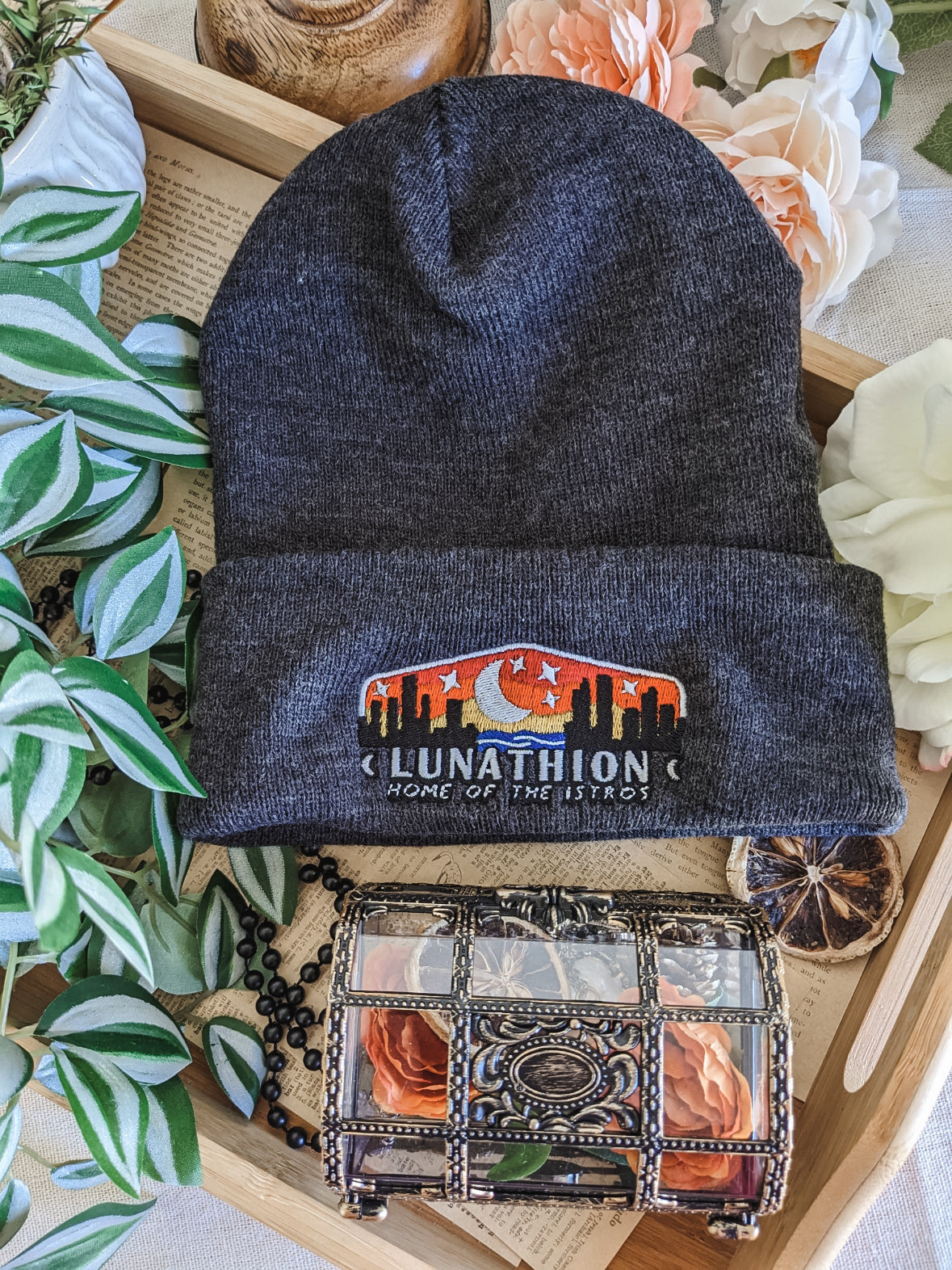 The clerk at the Lunathion Tourism Center would like you to know that this beanie is great for outdoors, sports, and everyday. Made in a unisex cuffed style, it is snug and form-fitting. All beanies are cuffed and you have the option of with or without a pom pom.